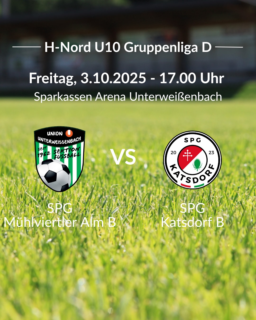 Am Freitag, den 3. Oktober 2025, empfängt unsere SPG Mühlviertler Alm B in der Sparkassen Arena Unterweißenbach die SPG Katsdorf B. Unsere Nachwuchskicker sind hochmotiviert und freuen sich auf ein spannendes Match in der Gruppenliga!