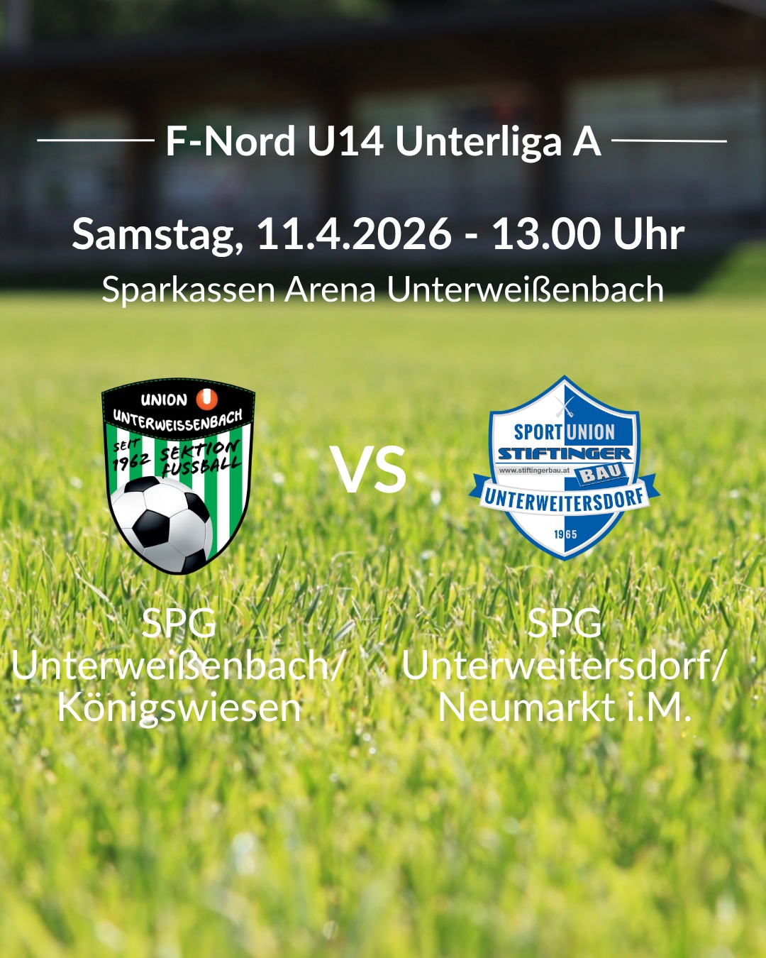 Am Samstag, den 11. April 2026, steht für unsere SPG Unterweißenbach/Königswiesen das nächste Spiel in der F-Nord U14 Unterliga A an. Zu Gast ist die SPG Unterweitersdorf/Neumarkt i.M. 🔥