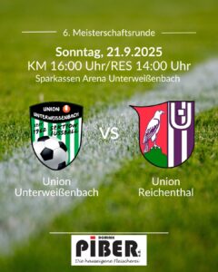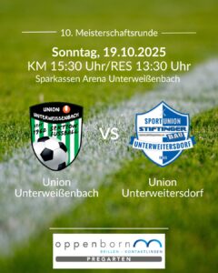 Am Sonntag, den 19. Oktober 2025, empfängt unsere Union Unterweißenbach die Union Unterweitersdorf in der Sparkassen Arena Unterweißenbach. Unsere Mannschaft ist top motiviert und freut sich auf zahlreiche Fans und lautstarke Unterstützung von den Rängen! 🙌 📅 Sonntag, 19. Oktober 2025 📍 Sparkassen Arena Unterweißenbach ⚽ Reserve: 13:30 Uhr | Kampfmannschaft: 15:30 Uhr Kommt vorbei, …
