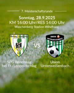 7. Meisterschaftsrunde – Auswärtsspiel gegen Windhaag/Leopoldschlag! ⚽💚 In der Vorrunde gegen Reichenthal konnten wir leider keine Punkte mitnehmen – jetzt heißt es voller Fokus auf das nächste Spiel! Am Sonntag wartet die SPG Windhaag/Leopoldschlag im Waschenberg Stadion auf uns. Unsere Mannschaft ist hochmotiviert und will auswärts wieder punkten! 💪🏼 📅 Sonntag, 28. September 2025📍 Waschenberg …