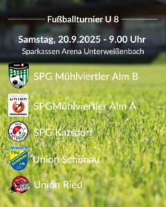 Am Samstag, 20. September 2025 findet ab 9:00 Uhr in der Sparkassen Arena Unterweißenbach das U8-Fußballturnier statt. Mit dabei sind folgende Mannschaften: SPG Mühlviertler Alm B SPG Mühlviertler Alm A SPG Katsdorf Union Schönau Union Ried Ein spannender Turniertag mit vielen jungen Talenten ist garantiert – für Spannung, Tore und Fußballfreude ist gesorgt. Auch für …