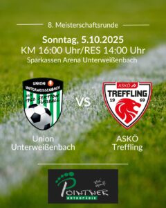 8. Meisterschaftsrunde – Heimspiel gegen Treffling! ⚽💚 Nach dem letzten Auftritt wollen wir nun im Heimspiel wieder voll angreifen! Am Sonntag empfängt unsere Mannschaft den ASKÖ Treffling in der Sparkassen Arena Unterweißenbach. Mit Unterstützung unserer Fans will das Team unbedingt die nächsten Punkte holen! 💪🏼 📅 Sonntag, 5. Oktober 2025 📍 Sparkassen Arena Unterweißenbach ⚽ …