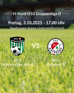 U10 Heimspiel in Unterweißenbach ⚽💚 Am Freitag, den 3. Oktober 2025, empfängt unsere SPG Mühlviertler Alm B in der Sparkassen Arena Unterweißenbach die SPG Katsdorf B. Unsere Nachwuchskicker sind hochmotiviert und freuen sich auf ein spannendes Match in der Gruppenliga! 🕔 17:00 Uhr – H-Nord U10 Gruppenliga D: SPG Mühlviertler Alm B vs SPG Katsdorf …